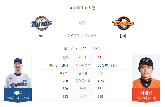 | 10월 2일 프로야구 KBO NC VS 한화 프리뷰 일정 (0) | 2023.10.02 |