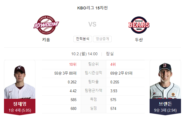 두산 베어스는 브랜든 와델(9승 3패 2.94 ERA)을 선발로 내세워 경기에 나섭니다. 그러나 와델은 최근 3경기에서 기복이 심한 투구가 나오고 있으며, 키움 상대로는 원정에서 안정적인 투구를 해냈지만 홈에서는 언제든 반등이 가능한 투수입니다.
