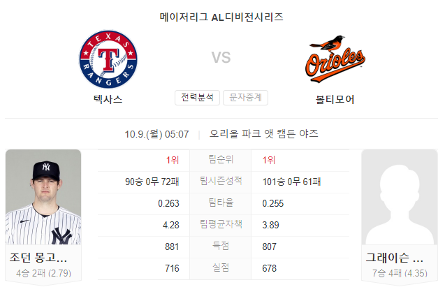 볼티모어 오리올스는 포스트시즌에서 첫 등판하는 그레이슨 로드리게스를 선발로 내세웁니다. 그러나 그레이슨 로드리게스는 이번 시즌 텍사스 상대로 좋지 않은 모습을 보였습니다.