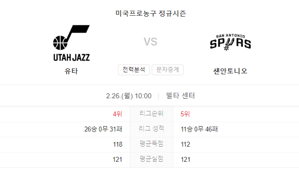 2월 26일 NBA 샌안토니오 스퍼스 VS 유타 재즈 경기 예측