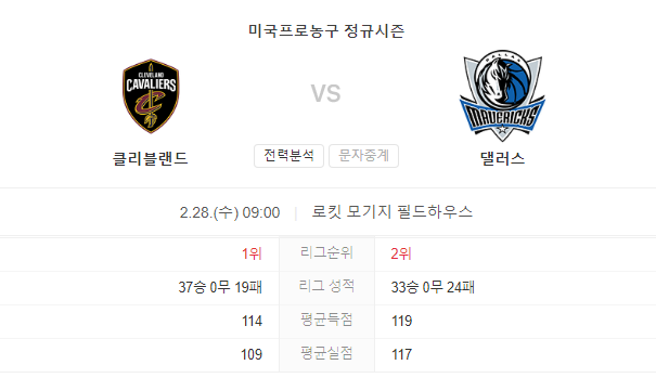 2월 28일 NBA 달라스 매버릭스 VS 클리블랜드 캐벌리어스 경기 예측