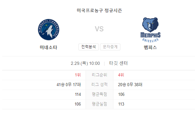 2월 29일 NBA 멤피스 그리즐리스 VS 미네소타 팀버울브스 경기 예측