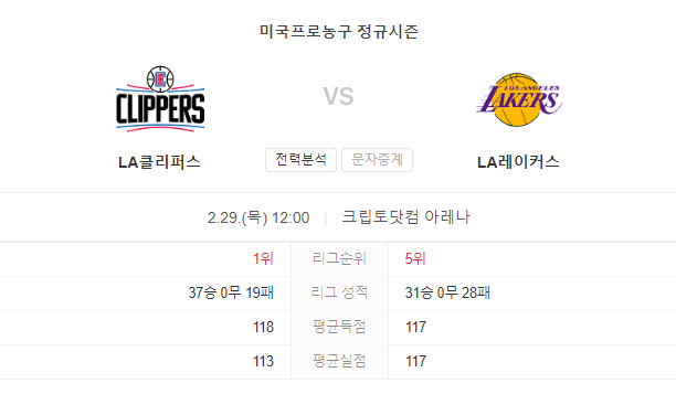2월 29일 NBA LA 레이커스 VS LA 클리퍼스 경기 예측