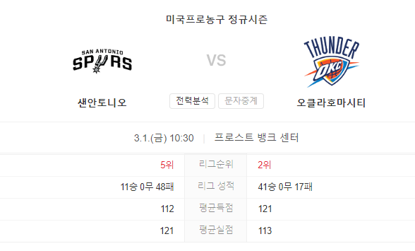 3월 1일 NBA 오클라호마시티 썬더 VS 샌안토니오 스퍼스 경기 예측