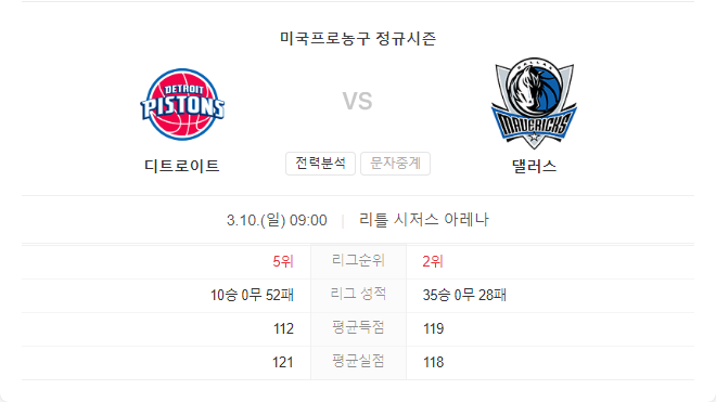 3월은 NBA의 강팀들이 실수를 허용할 수 없는 시기입니다. 달라스 매버릭스는 이 경기에서 분명한 우위를 가지고 있으며, 플레이오프에 강한 위치에서 진출하기를 원한다면 반드시 승리해야 할 경기입니다.