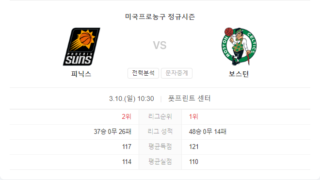 이 경기는 피닉스 선즈에게 현재 더 큰 중요성을 가지고 있습니다. 그들은 플레이-인 토너먼트를 피하기 위해 서부 컨퍼런스 상위 6위 안에 들기 위해 모든 것을 다 할 것입니다. 반면, 보스턴 셀틱스의 최근 경기력은 다소 하락세를 보이고 있으며, 이는 그들이 시즌 말미에 전체 리그에서 가장 좋은 성적을 확보할 것이 명확하기 때문에 어느 정도 예상된 바입니다.