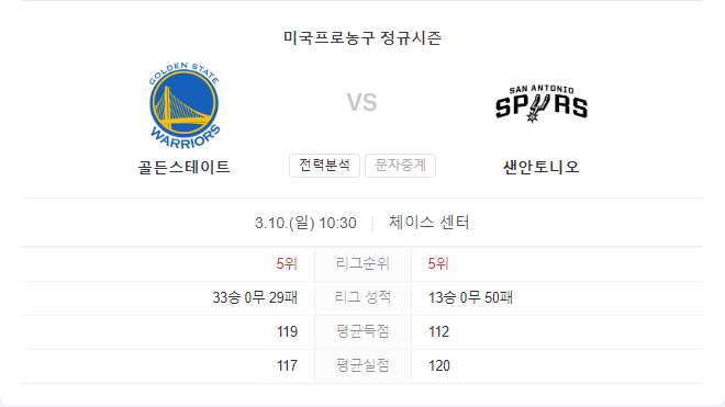 골든스테이트 워리어스는 정규 시즌 말미와 플레이오프 진출을 위한 위치 확보를 결정짓는 중요한 단계에 있습니다. 커리의 부재가 예상되지만, 서부 컨퍼런스 최하위 팀인 샌안토니오 스퍼스를 상대로 충분히 승리할 수 있는 품질을 갖추고 있습니다.