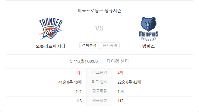 오클라호마시티 썬더는 현재 멤피스 그리즐리스보다 더 우수한 성적을 보이고 있으며, 특히 공격에서의 높은 효율성이 돋보입니다. 반면, 멤피스 그리즐리스는 주요 선수들의 부상으로 인해 어려움을 겪고 있으며, 이번 경기에서도 쉽지 않은 경기가 예상됩니다. 오클라호마시티 썬더가 이번 대결에서 우위를 점할 것으로 보이며, 대승을 거둘 가능성이 높습니다.