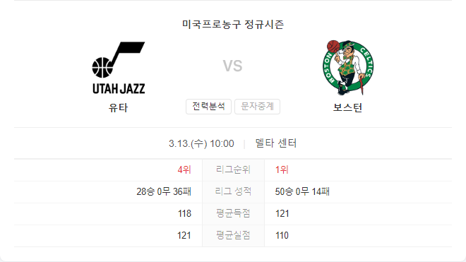 보스턴 셀틱스는 원정에서 조금 약한 모습을 보이기는 했지만, 이번 경기에서의 승리는 그들이 NBA 리그 선두를 유지하는 데 중요합니다. 유타 재즈의 주요 선수 라우리 마카넨의 부재는 셀틱스의 승리 가능성을 더욱 높입니다. 보스턴 셀틱스는 현재의 품질과 상태를 고려할 때 승리를 확보하는 데 어려움이 없을 것으로 예상됩니다.