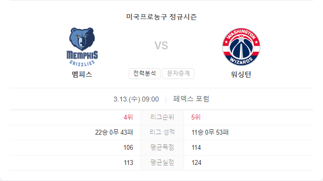 이번 경기는 두 팀 모두 플레이오프에 진출하지 못할 것이 확실하지만, 승리를 향한 노력은 계속됩니다. 첫 번째 경기에서는 워싱턴 위저즈가 승리를 거두었으며, 이번에는 멤피스에서의 경기입니다. 워싱턴 위저즈의 최근 상승세와 멤피스 그리즐리스의 공격 부진을 고려할 때, 이번 경기는 또한 워싱턴 위저즈가 승리할 가능성이 높아 보입니다.