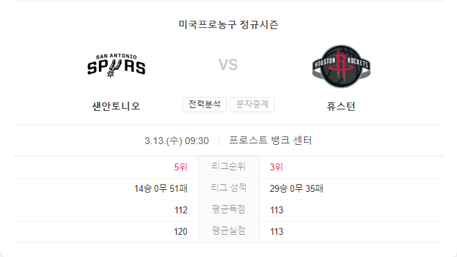 이번 경기는 휴스턴 로케츠가 샌안토니오 스퍼스를 상대로 우위를 점할 가능성이 높습니다. 로케츠는 최근 성적이 다소 부진하지만, 여전히 스퍼스보다는 더 나은 경기력을 보여주고 있습니다. 스퍼스는 최근 몇 년 동안 재건 과정에 있으며, 이번 시즌에도 플레이오프 진출에 실패했습니다.