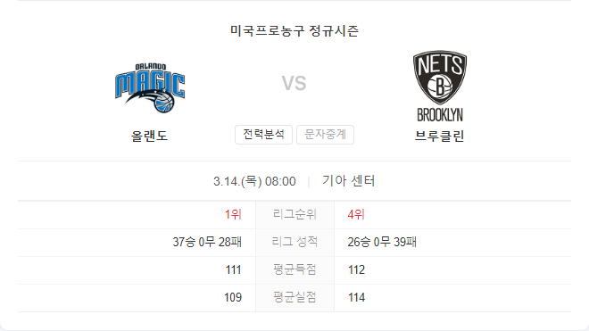반면, 브루클린 네츠는 최근 다소 나아진 모습을 보이고 있으나, 올랜도 매직의 강력한 듀오를 막아내기에는 부족할 것으로 보입니다. 따라서, 올랜도 매직이 이번 대결에서 우위를 점할 것으로 예상되며, 경기의 총 득점은 제시된 한계점보다 낮을 것으로 예상됩니다.
