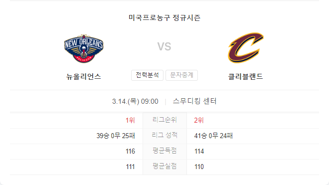 3월 14일 NBA 클리블랜드 캐벌리어스 VS 뉴올리언스 펠리컨즈 경기 예측