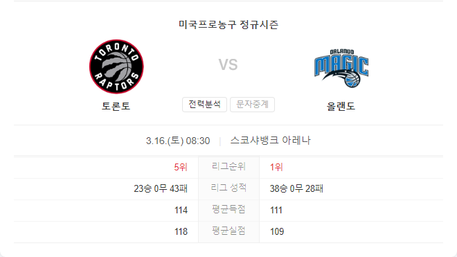 3월 16일 NBA 올랜도 매직 VS 토론토 랩터스 경기 예측
