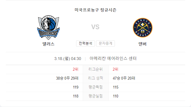 달라스 매버릭스와의 원정 경기에서는 그들의 수비를 뚫고 리바운드에서 우위를 점하는 것이 중요합니다. 너겟츠는 이번 경기에서 팀워크와 다양한 공격 옵션을 바탕으로 승리를 노립니다.