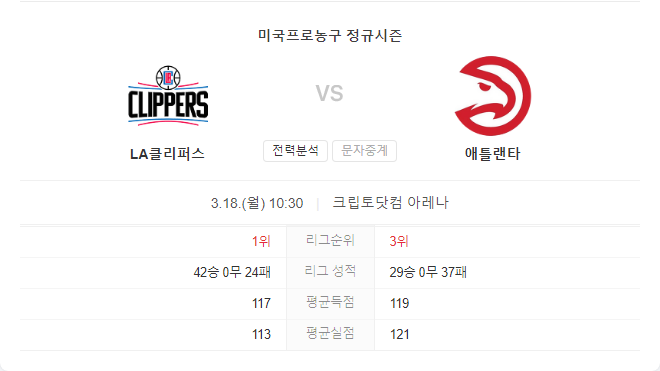 이번 LA 클리퍼스와 애틀랜타 호크스의 맞대결에서는 클리퍼스가 우위를 점할 것으로 예상됩니다. 클리퍼스는 이번 시즌 여러 차례 애틀랜타를 상대로 우위를 점한 바 있으며, 이번 경기에서도 그 우세를 이어갈 것으로 보입니다. 애틀랜타는 최근 몇 년간 보여준 잠재력을 다시 찾기 위한 노력이 필요한 시기입니다.