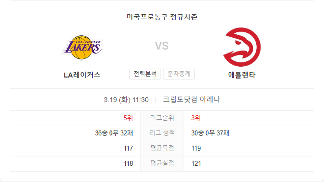 3월 19일 NBA 애틀란타 호크스 VS LA 레이커스 경기 예측