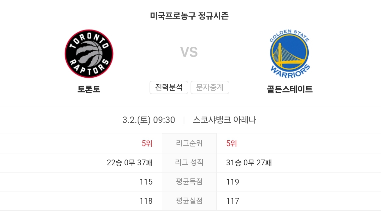 3월 2일 NBA 골든스테이트 워리어스 VS 토론토 랩터스 경기 예측