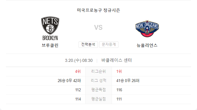 3월 20일 NBA 뉴올리언스 펠리컨즈 VS 브루클린 네츠 경기 예측
