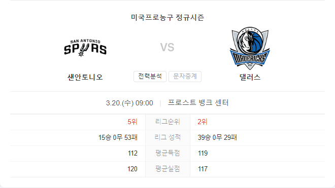 3월 20일 NBA 달라스 매버릭스 VS 샌안토니오 스퍼스 경기 예측