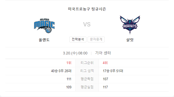 올랜도 매직은 최근 좋은 분위기를 이어가고 있으며, 샬럿 호넷츠를 상대로도 유리한 입장에서 경기를 펼칠 것으로 예상됩니다. 반면, 샬럿 호넷츠는 연패에서 탈출하기 위해 고군분투하고 있지만, 올랜도 매직과의 전력 차이를 극복하기에는 다소 어려움이 있을 것으로 보입니다. 따라서 이번 경기에서는 올랜도 매직이 샬럿 호넷츠를 상대로 승리를 거둘 것으로 예상됩니다.