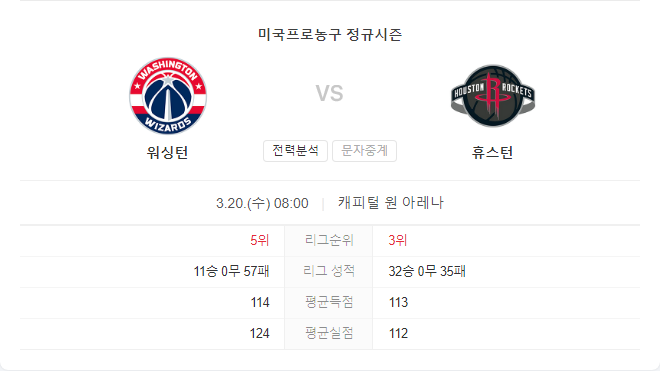 휴스턴은 최근 5경기에서 승리하며 상승세를 타고 있는 반면, 워싱턴은 여러 가지 어려움을 겪고 있어 이번 경기에서 휴스턴이 유리할 것으로 예상됩니다.