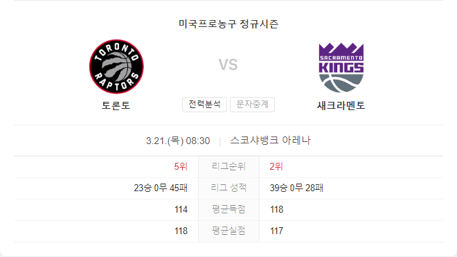 3월 21일 NBA 세크라멘토 킹스 VS 토론토 랩터스 경기 예측