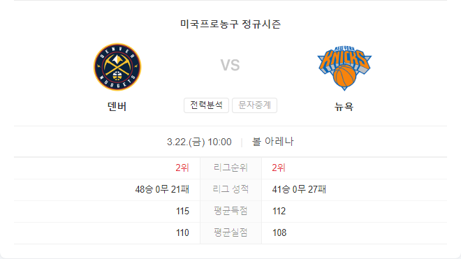 3월 22일 NBA 뉴욕 닉스 VS 덴버 너겟츠 경기 예측