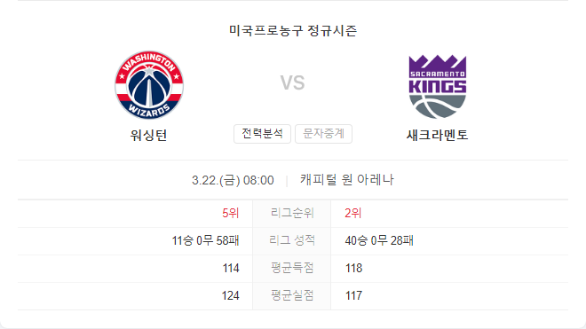 3월 22일 NBA 세크라멘토 킹스 VS 워싱턴 위저즈 경기 예측