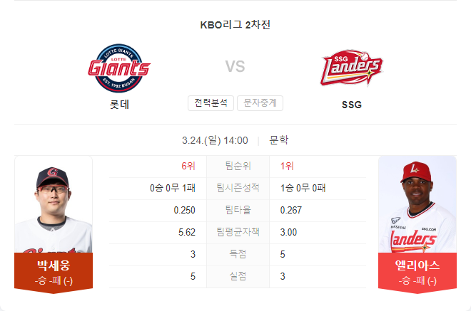 3월 24일 KBO 프로야구 롯데 자이언츠 VS SSG 랜더스 경기 예측