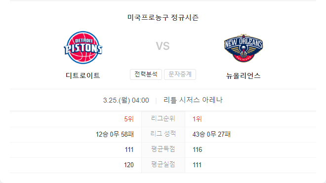 뉴올리언스 펠리컨즈는 서부 컨퍼런스 상위권 팀으로, 최근 경기에서 좋은 모습을 보여주고 있습니다. 반면, 디트로이트 피스톤즈는 다수의 주요 선수들이 부상으로 인해 결장 중이며, 동부 컨퍼런스 최하위에 머물고 있습니다. 이러한 상황을 고려했을 때, 뉴올리언스 펠리컨즈가 이번 경기에서 우위를 점할 가능성이 높아 보입니다.