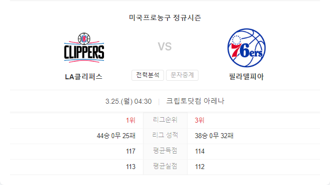 3월 25일 NBA 필라델피아 세븐티식서스 VS LA 클리퍼스 경기 예측
