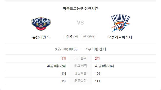 3월 26일 NBA 오클라호마시티 썬더 VS 뉴올리언스 펠리컨즈 경기 예측