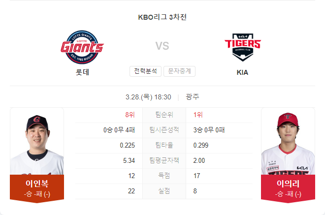 3차전 경기에서는 기아 타이거즈가 승리할 것으로 예상됩니다. 기아의 선발 이의리는 후반기 들어 보여준 안정적인 제구력과 강력한 구위를 바탕으로 롯데 타선을 제압할 것으로 보입니다. 반면, 롯데의 이인복은 부상 후유증과 시범경기에서 보인 기복있는 모습이 우려되며, 기아 타선의 초반부터 시작될 맹공에 대응하기 어려울 것으로 예상됩니다.
