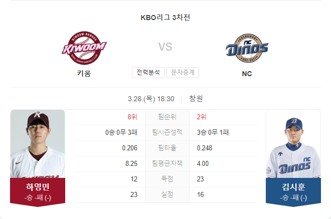 반면, 하영민은 시범경기에서 불안정한 모습을 보였고, 선발로 낙점된 배경에도 불구하고 여전히 불안요소가 많습니다. 또한, 팀 타선의 상태와 불펜 경쟁력에서도 NC 다이노스가 우위에 있으며, 이러한 종합적인 요소들이 경기의 승리로 이어질 것으로 보입니다.