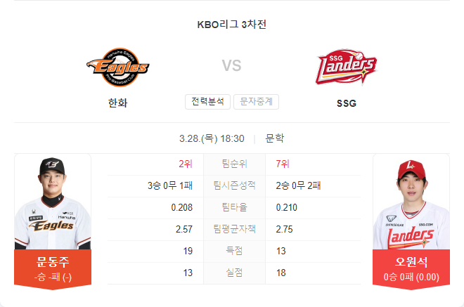 3월 28일 KBO 프로야구 한화 이글스 VS SSG 랜더스 경기 예측