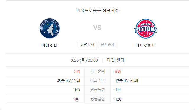 이 경기에서는 미네소타 팀버울브스가 디트로이트 피스톤즈를 상대로 우위를 점할 것으로 예상됩니다. 팀버울브스는 홈에서 강력한 모습을 보이고 있으며, 디트로이트 피스톤즈를 상대로 8번째 연속 패배를 안길 것으로 보입니다.