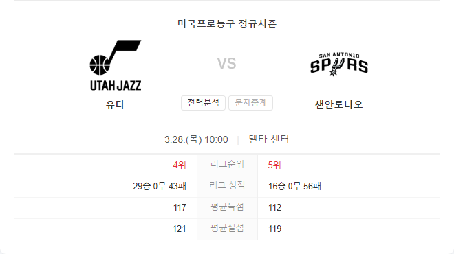 이번 경기는 두 팀 모두 플레이오프 진출이 사실상 어려운 상황에서 진행되는 경기입니다. 샌안토니오 스퍼스는 비록 시즌 대부분을 어려움 속에서 보냈지만, 유타 재즈와의 이번 경기에서는 새로운 가능성을 모색할 수 있습니다.