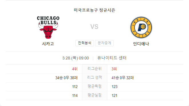 시카고 불스는 연속 3패를 기록하며 형편없는 상태입니다. 현재 34승 28패로 플레이인에 진출할 위치에 있으나, 홈에서의 성적은 37경기 중 18승에 그치고 있습니다. 시즌 내내 다수의 부상으로 인해 전체 기록에 영향을 받았습니다.