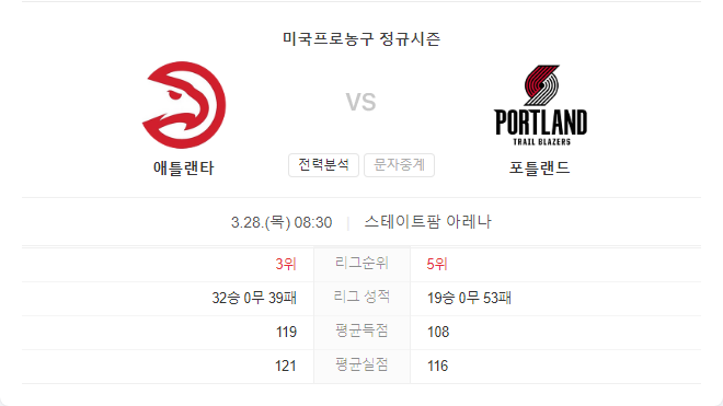 양 팀 모두 부상으로 어려움을 겪고 있지만, 애틀랜타 호크스는 최근 동부컨퍼런스 최고의 팀 중 하나인 보스턴 셀틱스를 상대로 대역전승을 거둔 바 있습니다. 반면 포틀랜드 트레일블레이저스는 연패의 늪에 빠져 있으며 주요 선수들의 부상으로 인해 전력이 크게 약화되었습니다.