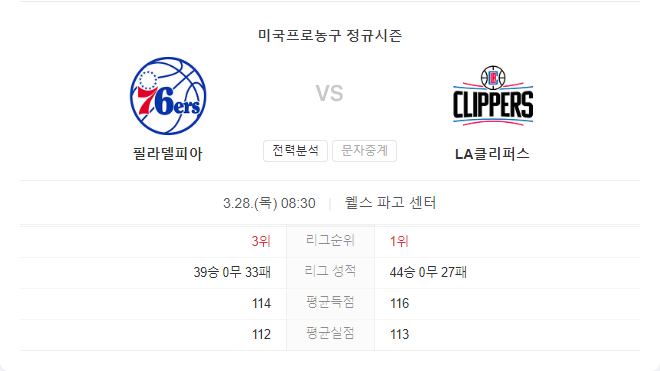 필라델피아 세븐티식서스는 여러 명의 주요 선수들이 결장하는 가운데 기량이 뛰어난 LA 클리퍼스를 상대로 승리를 거두기 위해 고군분투할 것입니다. 그러나 상대 팀의 좋은 컨디션을 고려할 때, 필라델피아가 이번 경기에서 성공을 거두기는 어려울 것으로 보입니다.