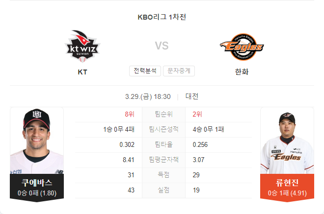 | 3월 30일 KBO 프로야구 KT 위즈 VS 한화 이글스 경기 예측 (0) | 2024.03.30 |