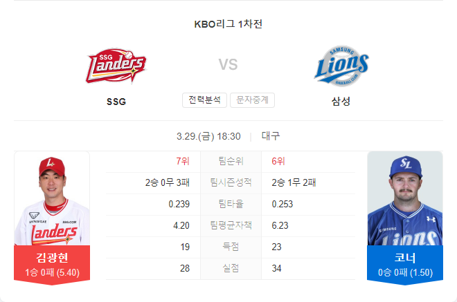 SSG 랜더스는 김광현을 선발 투수로 내세워 연패 저지에 나선다. 지난 롯데와의 홈 개막전에서 5이닝 동안 6안타 3실점으로 승리를 거두며 시즌을 시작했으나, 나이가 들어가는 것이 눈에 띄었다. 특히 작년 삼성을 상대로 홈 경기에서는 강세를 보였으나, 원정에서는 약한 모습을 보였던 김광현에게 이번 대구 원정 경기는 큰 도전이 될 것으로 보인다.