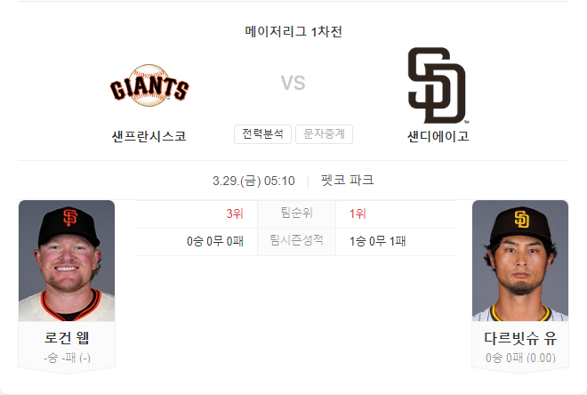 이번 샌프란시스코 자이언츠와 샌디에이고 파드레스의 경기는 매우 흥미로울 것으로 예상된다. 자이언츠는 로건 웹이 개막전 선발 투수로 나서며, 지난 시즌 좋은 성적을 거둔 바 있다. 반면, 파드레스는 다르빗슈가 시즌 두 번째 경기에 나서며, 그의 경험과 기량이 중요한 역할을 할 것으로 보인다.