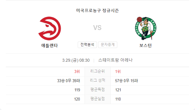 보스턴 셀틱스는 시즌 초부터 리그 상위권을 지키며 거의 내내 1위 자리를 유지하고 있습니다. 최근 10경기에서 9승을 기록하며, 오직 마지막 경기에서만 이번 상대인 애틀란타 호크스에게 패배를 기록했습니다. 즈루 홀리데이와 크리스탑스 포르징기스의 오프시즌 영입으로 모두가 알 수 있듯, 보스턴 셀틱스의 야망은 최고로 높습니다.
