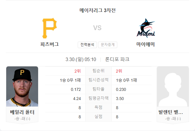 이번 경기는 양 팀 모두 타선이 다소 침체되어 있는 가운데, 선발 투수의 안정감이 승부의 열쇠가 될 전망입니다. 팔터는 마이애미전에서 강한 모습을 여러 차례 보여줬으며, 반면 벨로조는 스프링캠프에서 불안한 제구를 드러냈습니다. 피츠버그가 타선에서 조금만 터져준다면 투수진 우세를 앞세워 시리즈 두 번째 승리를 가져올 가능성이 높습니다.