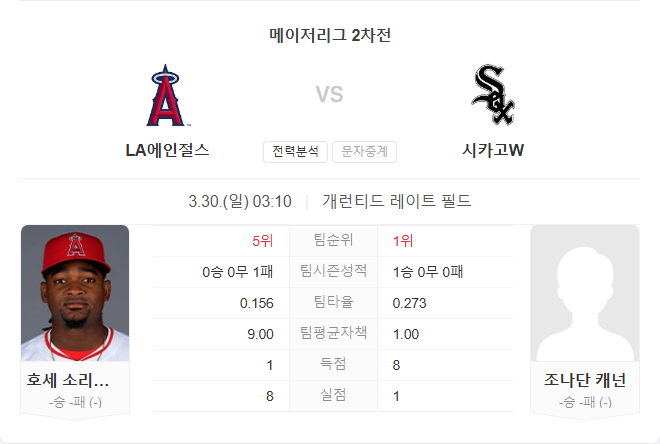 LA 에인절스는 개막전에서 시카고 화이트삭스에게 1-8로 패하며 부진한 출발을 보였습니다. 최근 5경기 전적은 1승 4패로 흐름이 좋지 않으며, 팀 타율은 .156으로 낮고, 출루율과 장타율 역시 각각 .229, .281에 머물고 있습니다. 개막전에서는 키쿠치 유세이가 3실점으로 흔들렸고, 불펜에서 라이언 존슨이 5실점을 허용하며 무너졌습니다.