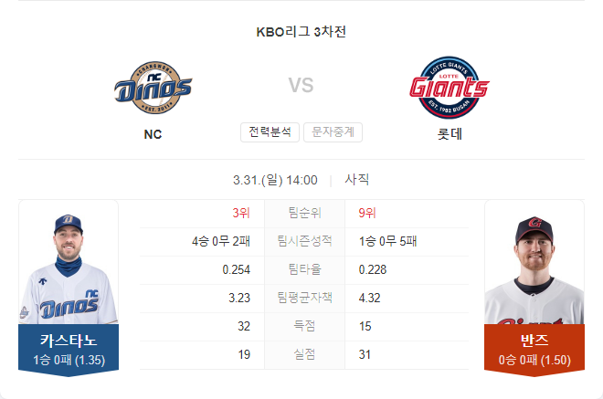 3월 31일 KBO 프로야구 NC 다이노스 VS 롯데 자이언츠 경기 예측
