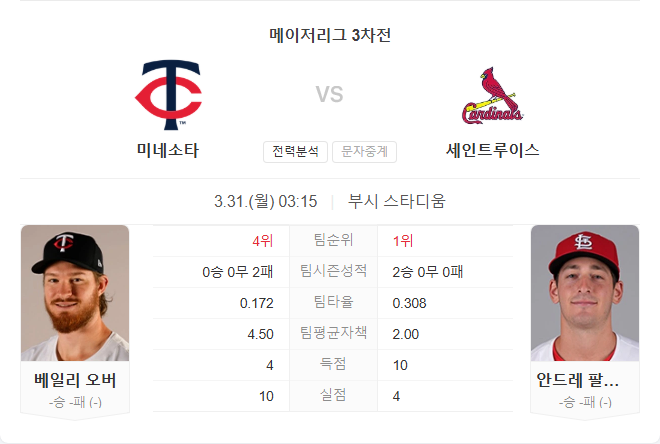 선발 투수는 베일리 오버입니다. 오버는 지난 시즌 12승 9패, ERA 3.98, WHIP 1.00의 준수한 성적을 기록했으며, 31경기에서 꾸준한 이닝 소화 능력을 보여줬습니다. 카디널스와는 2021년 한 차례 맞붙어 4이닝 1실점을 기록한 바 있으며, 당시 경기장도 부시 스타디움이었습니다.