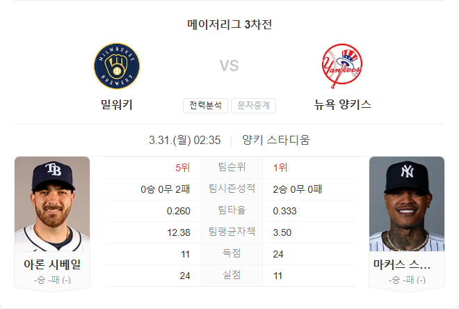 3월 31일 MLB 밀워키 브루어스 VS 뉴욕 양키스 타카짱의 경기 예측 분석